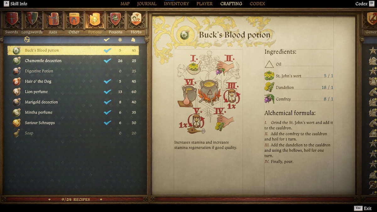 《The Hair o’ The Dog》配方是一个很好的入门配方,可以让你了解这些药剂的作用。在您尝试《天国降临 2》中的任何药水配方之前,你必须解锁食谱。这意味着从商人或药剂师那里购买或窃取食谱页面,然后学习它。当你知道了配方后,它就会进入你的炼金术书中,你可以在炼金术台前随时参考。