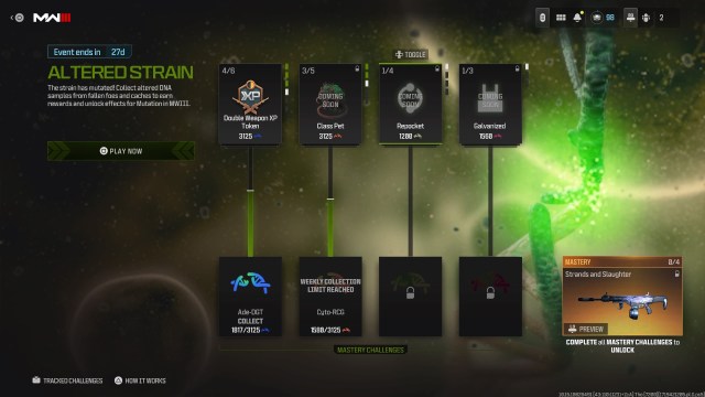 样本采用颜色编码,在撰写本文时,您无法获得黄色或红色 DNA。您需要黄色和红色样本来解锁增强功能,您可以在中查看这些解锁的进度事件页面的改变应变部分.