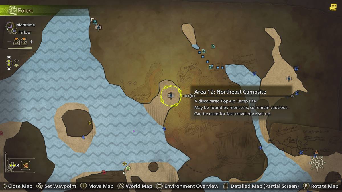 猩红森林中的大多数临时营地位置都位于或靠近森林地面。上面的地图显示了它们在区域地图上的位置(带有帐篷图标的路标),下表详细介绍了它们的名称和安全级别。