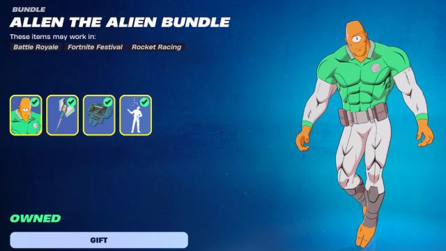 您可以从物品商店获得外星人艾伦。他可以单独购买,不包括 Back Bling 或其他配件,1,500 V 币,或作为捆绑包的一部分,其中包括表情、背饰和镐2,000 V 币.
