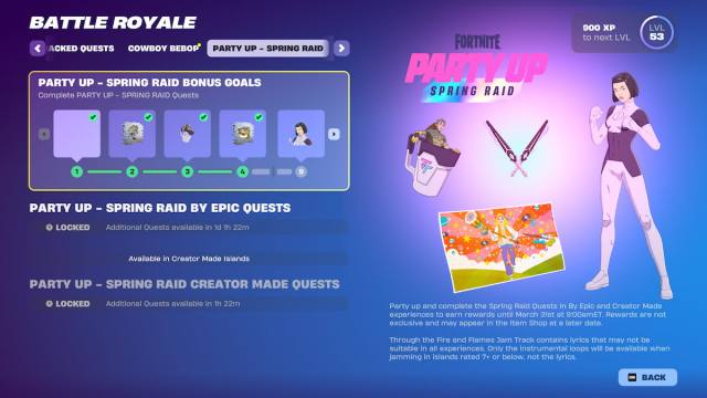 春季突袭活动从 3 月 14 日持续到 32 日,您只有大约两周的时间来赢得她。您可以通过与朋友一起玩 Epic Games 制作的体验以及创作者制作的体验来完成此活动。您的大厅中必须至少有一名其他玩家才能获得 XP 并完成这些任务。每隔几天就会有新任务开放,但所有任务都是相同的,并要求您在两种类型的体验中赚取更多经验值。