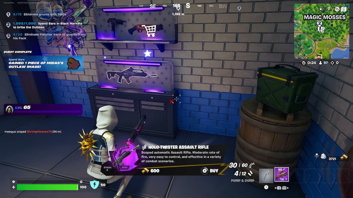 这是亡命之徒迈达斯的一个简单任务,只要没有其他玩家在黑市购买物品即可。访问三个黑市地点中的任意一个 - 魔法苔藓、彩虹之地或犯罪城 - 并花费 1,000 根金条。最好的方法是购买一件史诗级稀有武器和一些健康物品,例如盾牌罐或医疗包。