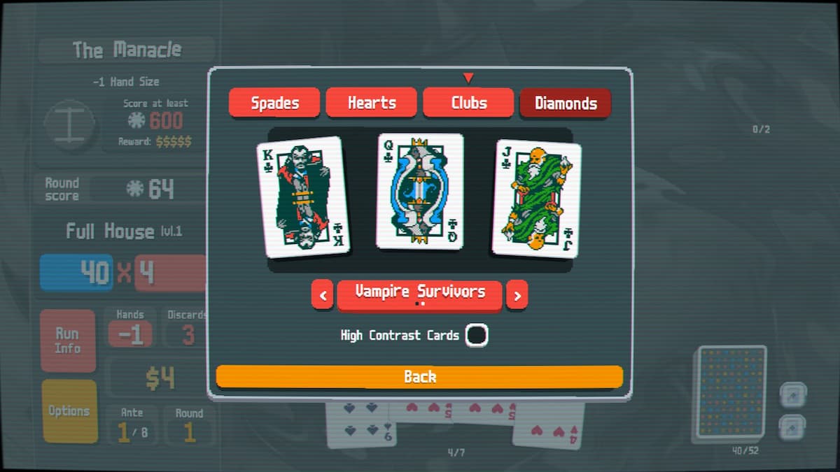 要在巴拉特罗中打开新角色卡,请按“退出”,然后在暂停菜单中前往“自定义”。在那里,您将能够通过单击左右箭头来打开(或关闭)每种花色(黑桃、红桃、梅花、方块)的自定义卡牌(这暗示将添加更多自定义选项)。如果高对比度卡片模式更美观或功能更好,您也可以打开它。