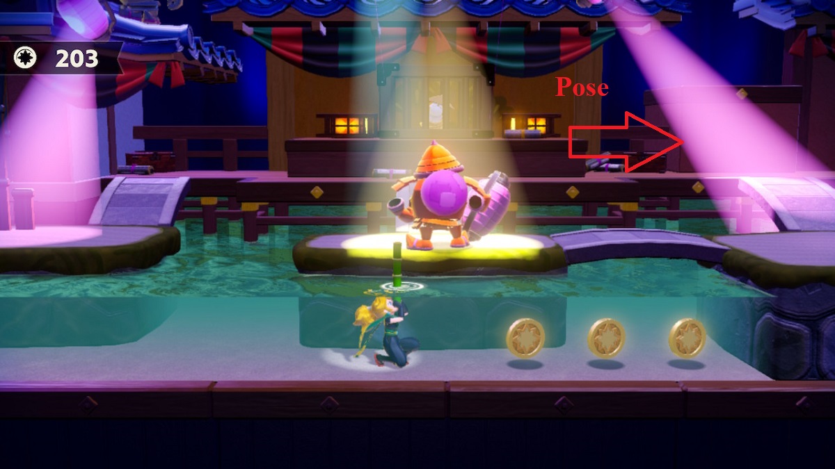 抓住第六颗宝石后,走到右边有聚光灯的地方,然后使用 ZL 或 ZR 摆姿势。这会将您带到一个地下部分,您可以在其中跳墙以获取硬币并在最后获得闪闪发光的宝石。然后,回到地面并再次摆姿势离开该区域。
