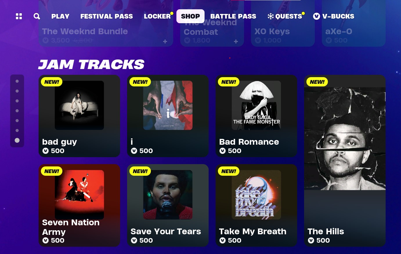 通过查看物品商店的 Fortnite Festival 部分,您可以找到各种可以购买的曲目500 V 币。最近,《堡垒之夜》开始展示各种各样的 Jam 曲目,但我们建议您抓住您最喜欢的曲目,以防它们消失。