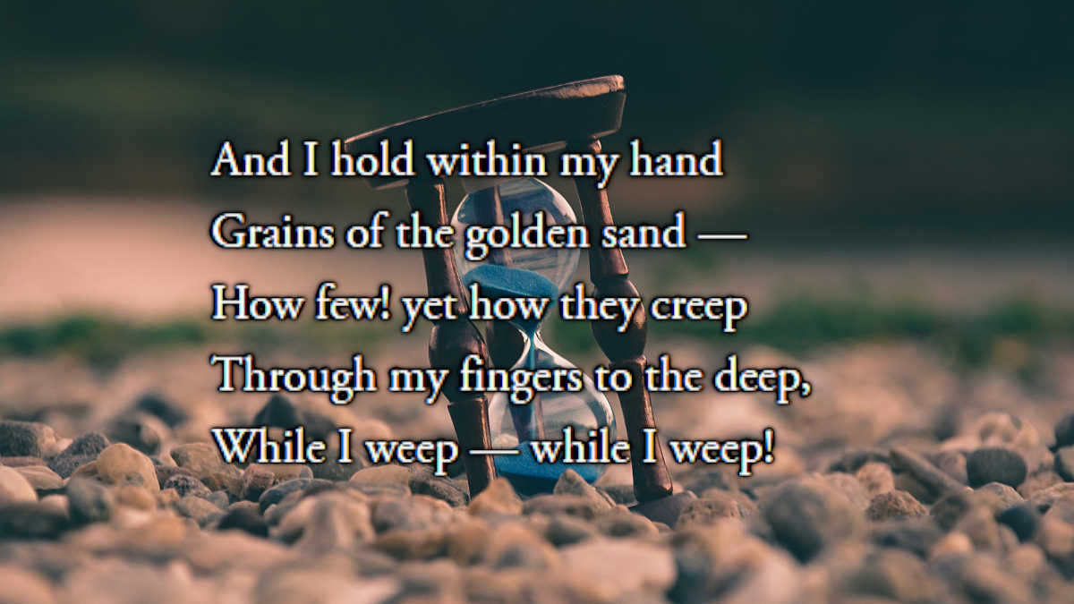 叙述者谈到金色的沙子从他的手指间滑落,许多分析过这首诗的人认为这金色的沙子是对时间本身的指代,无论叙述者多么拼命地试图抓住它,它都会从叙述者的手指间溜走。我认为随着年龄的增长,每个人都会产生这种恐惧。