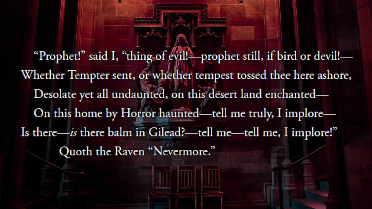 在《乌鸦》中,叙述者正试图从他的爱人莱诺尔的去世中恢复过来,这时一只乌鸦进入了他的家并栖息在半身像上。乌鸦只能说一个词——“永不复返”——而叙述者看着屋里的乌鸦,在愤怒和沉思之间摇摆。