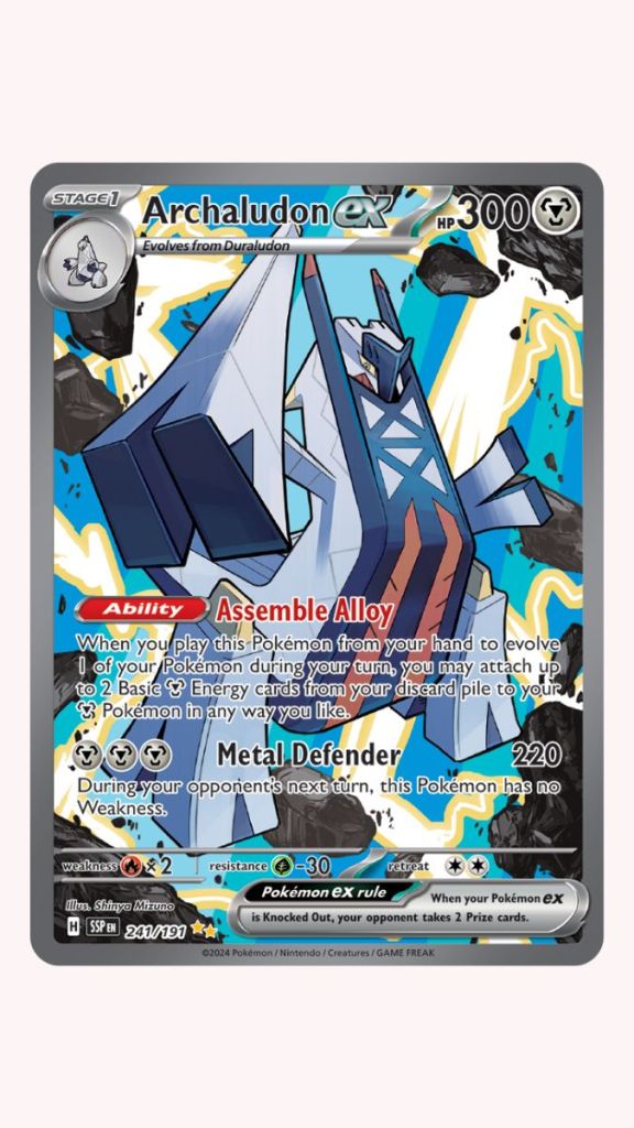 Archaludon ex 拥有组装合金来帮助它快速设置并为板凳注入能量。金属防御者是潜在的击倒攻击,造成强大的 220 点伤害,它提供针对关键弱点的保护.