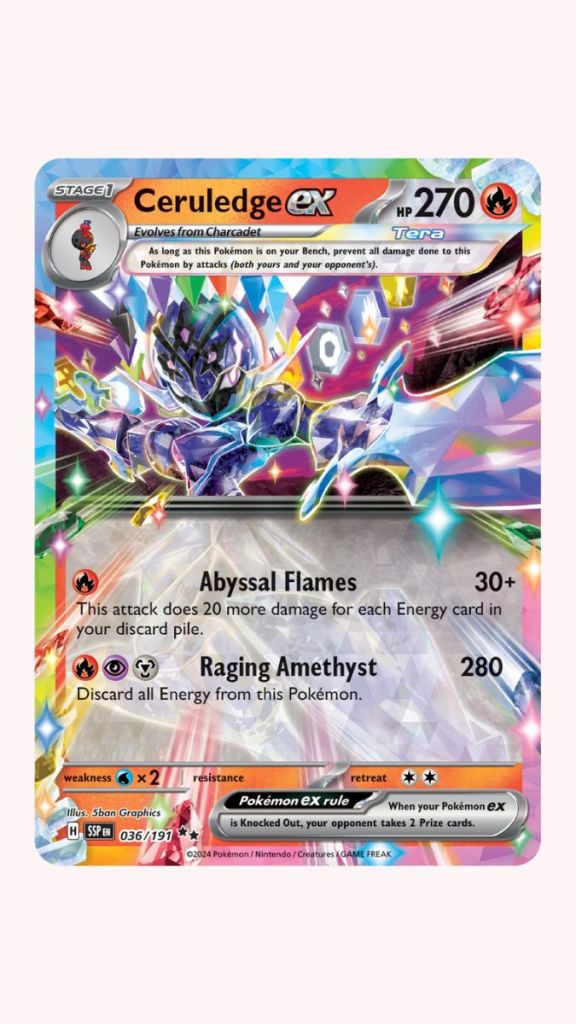Ceruledge ex 可能是 Surging Sparks 中最大的独立套牌之一。它属于能量丢弃游戏风格,狂暴紫水晶会造成巨大伤害并丢弃能量,而深渊火焰会随着丢弃堆中的每一个能量而增强。