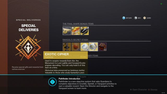 最后,Xur 每周都会提供一个 Exotic Cipher。你必须努力争取它,因为你需要完成 Vanguard 或 Exotic 播放列表中的活动才能使用它,但这是获得它们的可靠方法。
