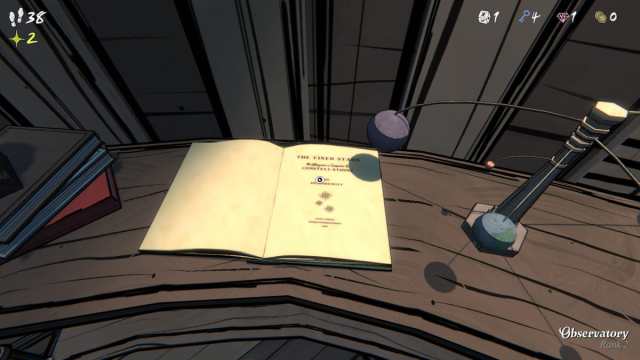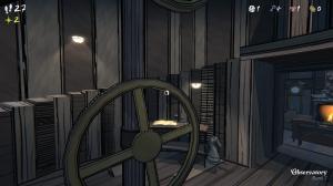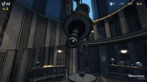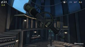 天文台室的望远镜总是位置不好,而且你的目标是使用旋转轮将其面向天空,使其位置正确。房间里有两个旋转轮,其中一个与仪器本身相连。这个旋转轮可以让你水平地移动望远镜。走楼梯走到路的尽头可以找到另一个旋转轮,这个旋转轮是用来改变望远镜的位置的垂直,允许其上下移动。