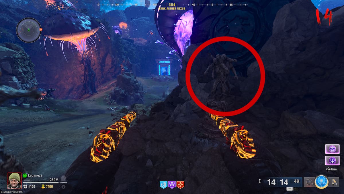 射击罗马数字以开始一场封闭的僵尸战斗。决战包括标准的不死敌人和特殊僵尸,其中使用野马和莎莉等武器至关重要。您还可以跟随球体查看下一批敌人接下来会在哪里产生。也请确保不要走出紫色圆圈,以防它阻止你的进步。然后,一旦它闪烁白色,你就可以拿起冰杖的头饰或法杖。