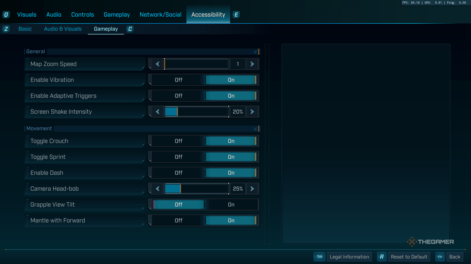 “辅助功能”选项卡包含一些您需要调整的游戏设置。我们强烈推荐您将屏幕震动强度和摄像头摆动设置降低至 25% 或更低。如果您愿意,可以完全关闭它们,但大约 25% 的值可以提供可靠的反馈,而不会令您迷失方向。