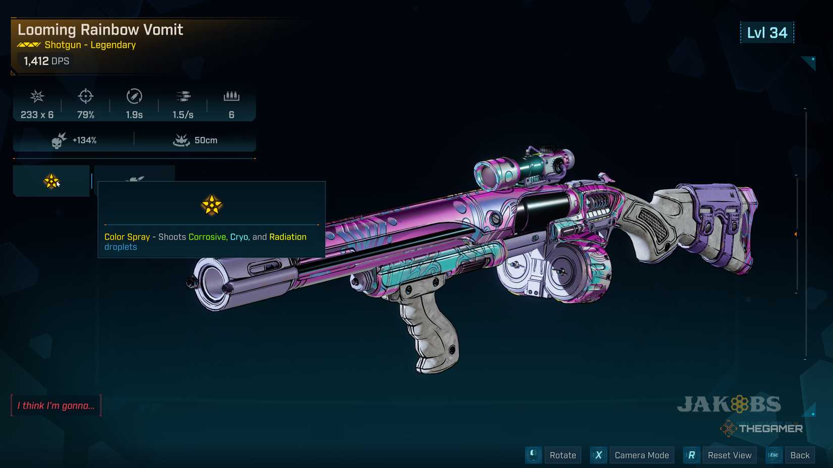 彩虹呕吐物是一个传奇雅各布斯霰弹枪,每次扣动扳机都会发射一簇射弹,并以弧线落下。它实际上是一个发射三种元素射弹的榴弹发射器。您在卷上获得的元素是随机的。