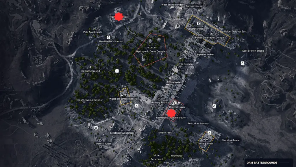 如果 Ruby Residence 运气不好的话,研究和行政大楼是另一个值得参观的好地方。有许多楼层、房间和容器可供抢劫。这个地方吸引了大量的 ARC 敌人,所以一定要小心那些。我已经添加了两座建筑物的位置和图像,这样您就不会在地图上迷路。
