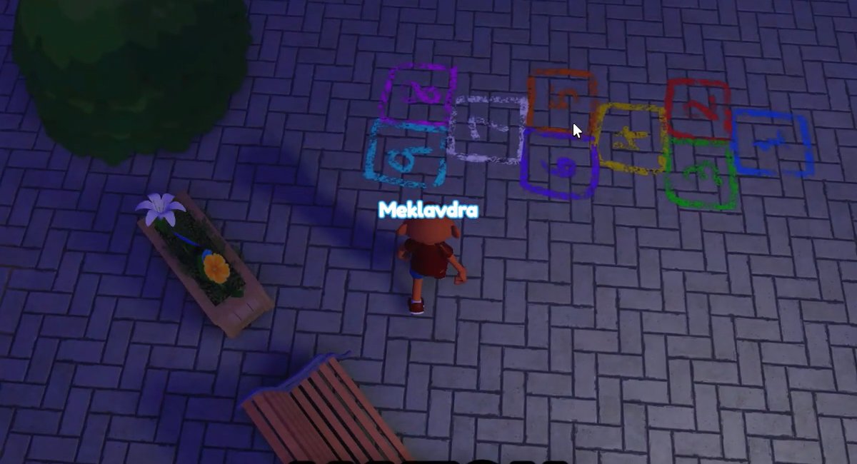 - 前往市场,您需要在其中输入代码使用跳房子粉笔在广场作为你的线索。输入与跳房子图中颜色相匹配的数字!