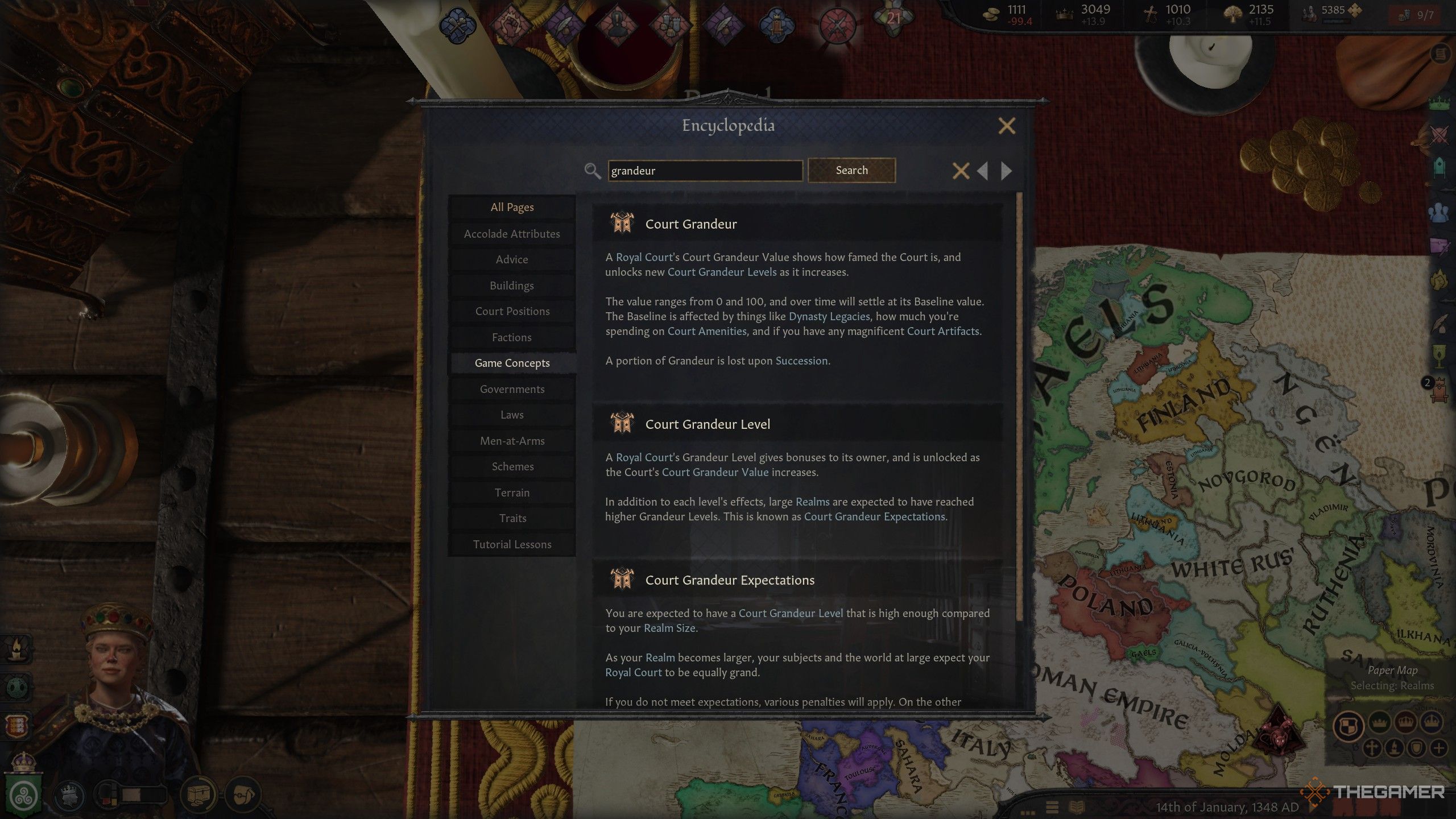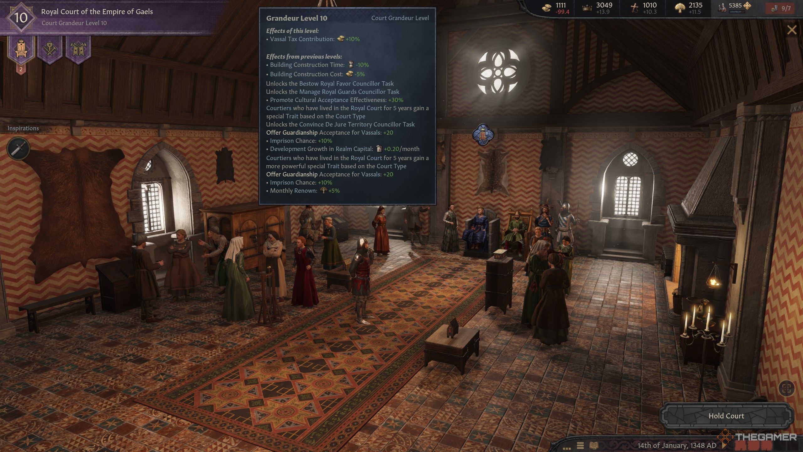游戏中每个足够大的领地的统治者都有一个皇家宫廷,尽管其最大范围是针对具有国王及以上头衔的统治者显示的。但这种规模是双向的。你越大,人们就越期望你拥有一个宏伟的庭院。这就是Court Grandeur 衡量的标准。你的宫廷威严越高,你的宫廷效果就越好,你的封臣就越会支持你。