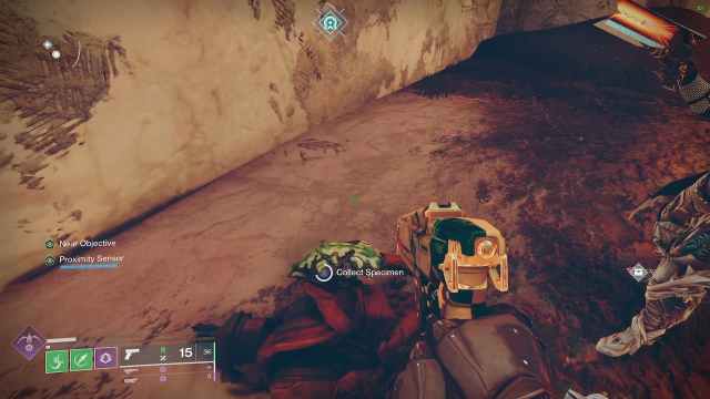 继续向前经过第一个扫描位置,你会发现第二个扫描位置位于倒下的 Vex 顶部。与该位置交互一次,然后第二次收集样本(恰好是一只青蛙)。