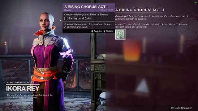 完成后崛起的合唱第一幕,伊科拉会要求在塔里与你交谈,开始第一个伪任务:遥远的答复。将会播放一个过场动画,向指挥展示他们改变后的 Vex 波。伊科拉向我们讲述了这个险恶的机械人从何而来的理论,并促使我们再次下降到涅索斯,正式开始“崛起的合唱团:第二幕”。