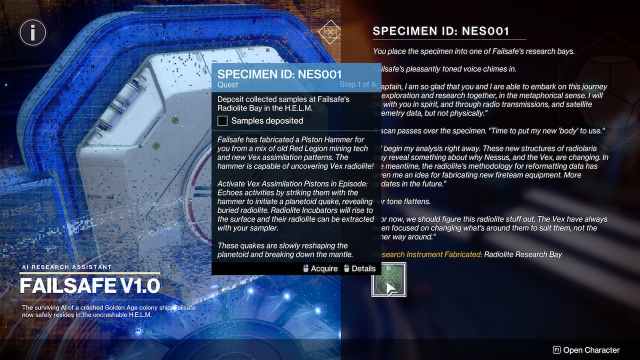 你唯一需要做的就是通过与 Failsafe 互动来向她报告,她会注意到 Vex 奇怪行为背后的身份是一个谜,我们可能需要对其进行更多研究。我们采集的标本将被命名为NES001并将在 H.E.L.M. 中开启新的任务和功能:无线电生命研究湾。她也会奖励你一个时光虫旅人侦察步枪然后就让你这样吧。