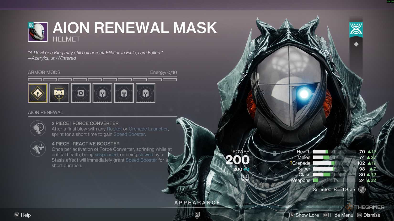 AION 适配器是 AION Renewal 套件的一个变体,可从神话级开普勒内容。这两件式奖金比两件式的 AION 续订奖励强得多,在火箭着陆或 GL 击杀时提供 20% 的 AoE 伤害抵抗增益,持续 15 秒。火箭包括火箭手枪、火箭脉冲步枪、火箭发射器、异国情调以及任何起源特征或发射火箭的异国情调武器。