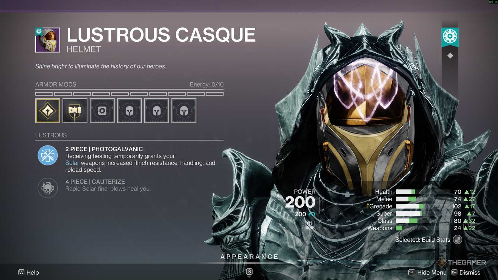 今年的至日事件专为太阳能主题建筑量身定制。这两件式奖金每当你痊愈时,太阳能武器的操控性、装弹速度和抗退缩能力都会得到小幅提升。治疗、恢复,甚至能量球的治疗都会触发此效果。当 Photogalvanic 处于活动状态时,你无法刷新它,并且每个统计数据的奖励大约为 +20。