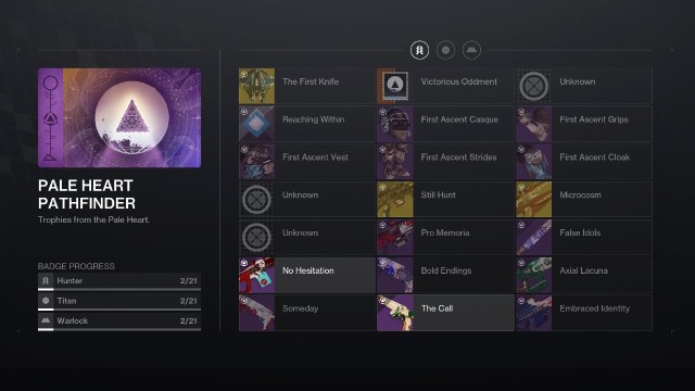要在《命运 2》中获得苍白之心探路者胜利,您需要收集苍白之心探路者收藏徽章中的所有物品。 “来自苍白之心的奖杯”是指获得徽章所需的最终形态装备的集合。