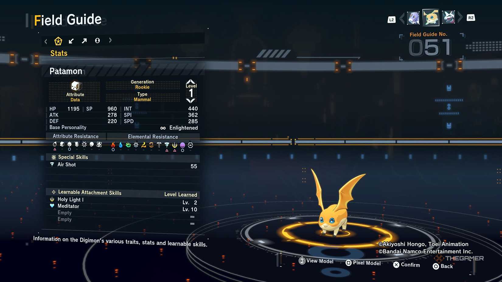 巴达兽的数码进化进一步建立在其先天优势之上,即高 SP 和 INT。此外,一旦您获得希望的数码蛋,你可以将Patamon进化成飞马座,少数有权势的人之一装甲数码兽在游戏中。