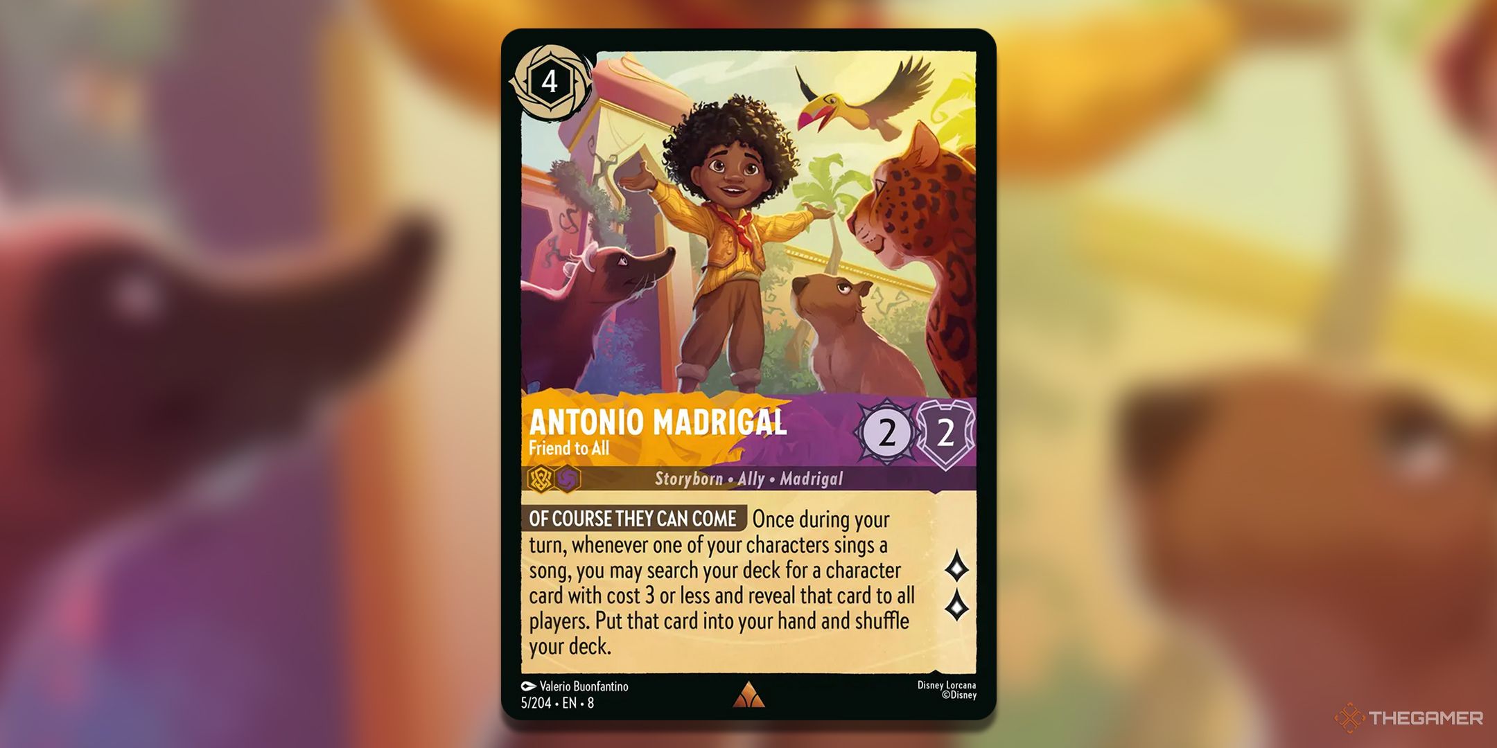 在你的牌组中搜索一张牌始终是一项强大的能力,安东尼奥让你在唱歌曲的每回合都这样做。问题是你找到的卡牌必须是成本为 3 或更少的角色,但这对于牌组中的 Pepa Madrigal、Antonio's Jaguar 和 Mirabelle Madrigal 等卡牌来说几乎没有限制。