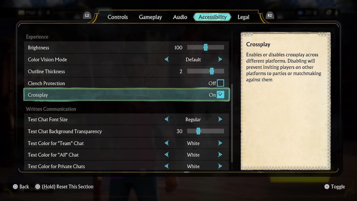 交叉游戏会自动激活,但如果您想确保交叉游戏处于打开或关闭状态,您可以通过按大厅中的“选项”按钮,导航到“辅助功能”选项卡并向下滚动到“交叉游戏”来选中或取消选中该框。