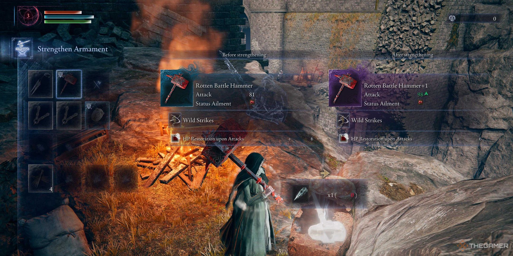 正如你所期望的,你可以升级武器埃尔登环夜行造成一些额外的伤害,但其机制与过去的《Soulsborne》游戏略有不同。你不需要十几个锻造石和一个铁匠来控制你的装备。