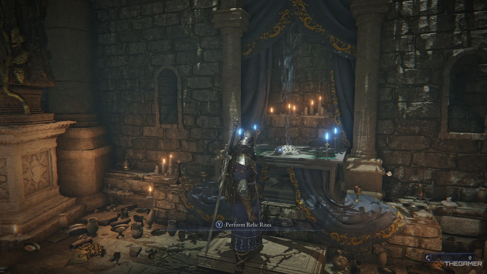 当您收到新的圣杯或新的圣物时,您可以前往特殊的舍利祭坛圆桌会议中心的中央。这是一个很小的区域,桌子旁边有蓝色的蜡烛和窗帘。