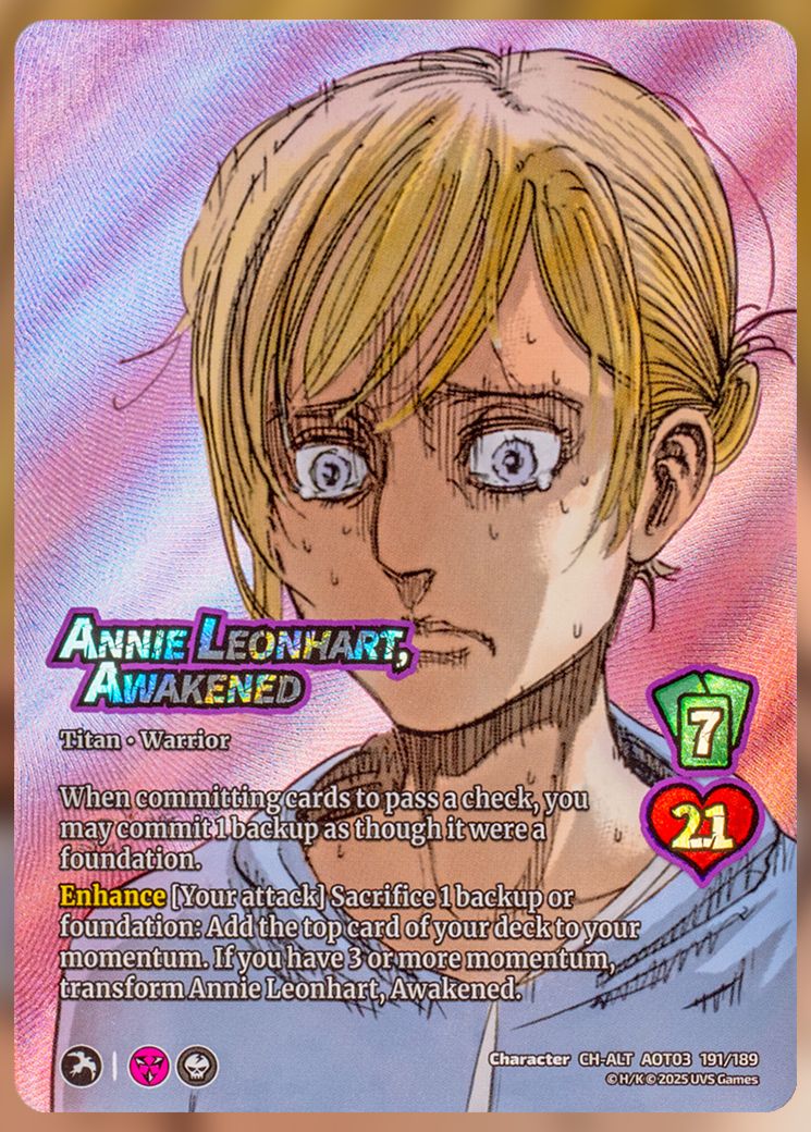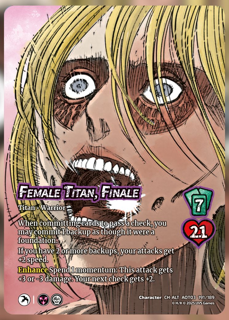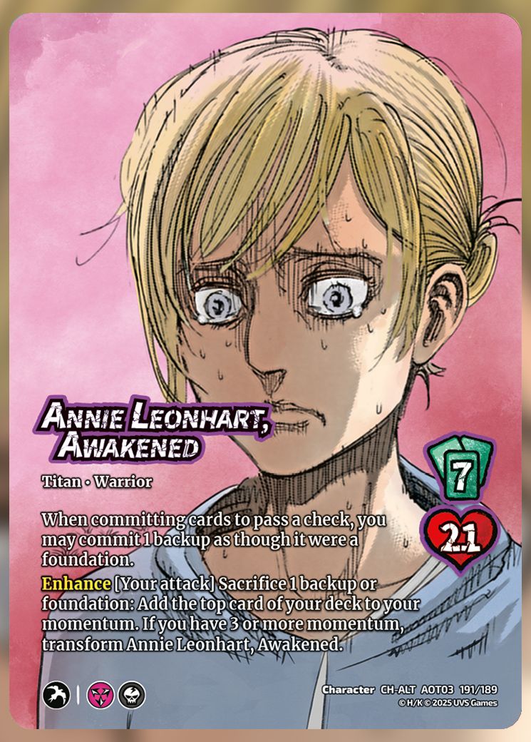 关闭 | 安妮·莱昂哈特《觉醒》泰坦 – 战士 – 7 手大小 – 21 生命值 – 混乱/死亡 当提交卡牌以通过检查时,您可以提交 1 个备份,就好像它是基础一样。 提高[你的攻击]牺牲1张备份或基础:将你牌组顶牌添加到你的势头中。如果你有 3 个或更多动力,请变身安妮·莱昂哈特,觉醒者。 女泰坦大结局泰坦 – 战士 – 7 手大小 – 21 生命值 – 混乱/死亡 当提交卡牌以通过检查时,您可以提交 1 个备份,就好像它是基础一样。 如果你有 2 个或更多备份,你的攻击速度就会+2。 提高花费 1 点动量:此攻击造成 +3 或 -3 伤害。你的下一张支票将获得+2。 |