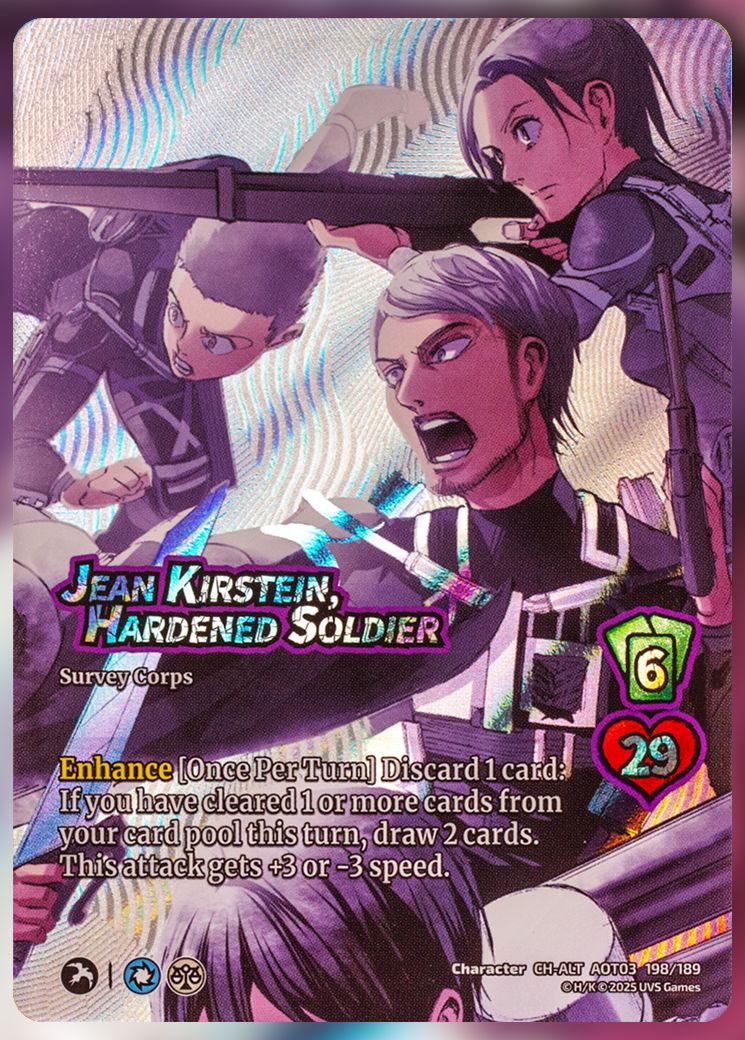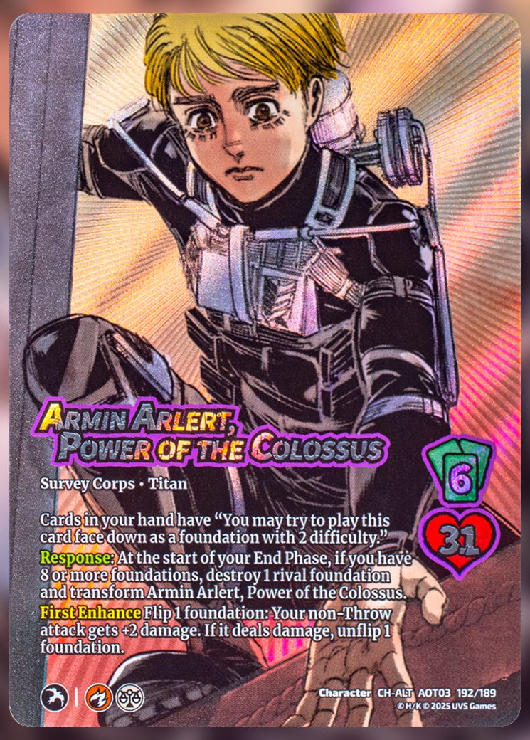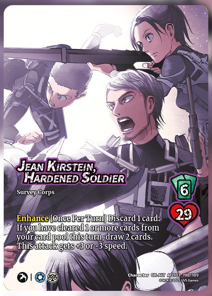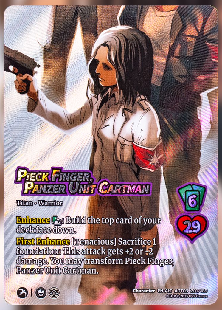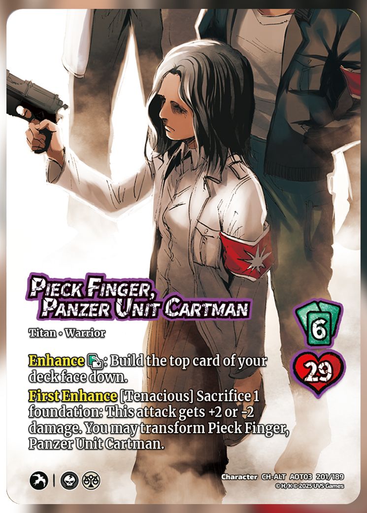 从艺术角度来说,我认为这是《进击的巨人》三部曲中我最喜欢的一部。它们都使用了漫画中的艺术,但它们在卡片上的放置方式看起来绝对令人惊叹,而其他系列则没有那么完美。我真的很喜欢《装甲泰坦》和《皮克手指》中的色彩,三笠、吉恩和康妮的取景也很突出。