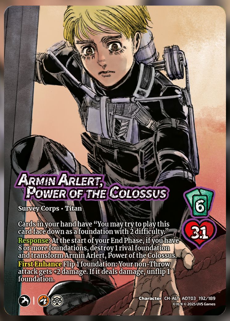 关闭 | 阿明·阿尔勒特《巨像的力量》调查兵团 – 泰坦 – 6 手大小 – 31 生命值 – 火/秩序 你手上的牌有“你可以尝试将这张牌面朝下打出作为基础,难度为2。” 回复:在你的结束阶段开始时,如果你有 8 个或更多基础,摧毁 1 个对手基础并转变阿明·阿尔勒特,巨像之力。 第一次增强翻转 1 个基础:你的非投掷攻击获得 +2 伤害。如果它造成伤害,则展开 1 个地基。 巨像泰坦,结局调查兵团 – 泰坦 – 6 手大小 – 31 生命值 – 火/秩序 提高翻转 1 基础:查看你牌组顶牌。你可以丢弃 1 张牌并抽 1 张牌。 提高牺牲 1 根地基:此攻击获得 +5 伤害。 |