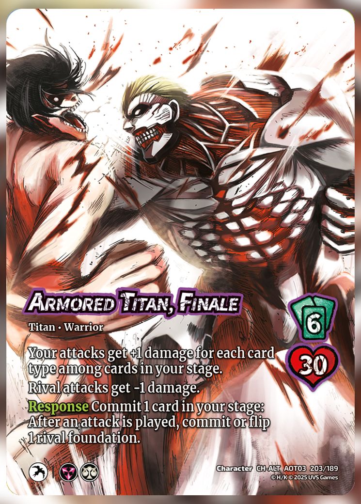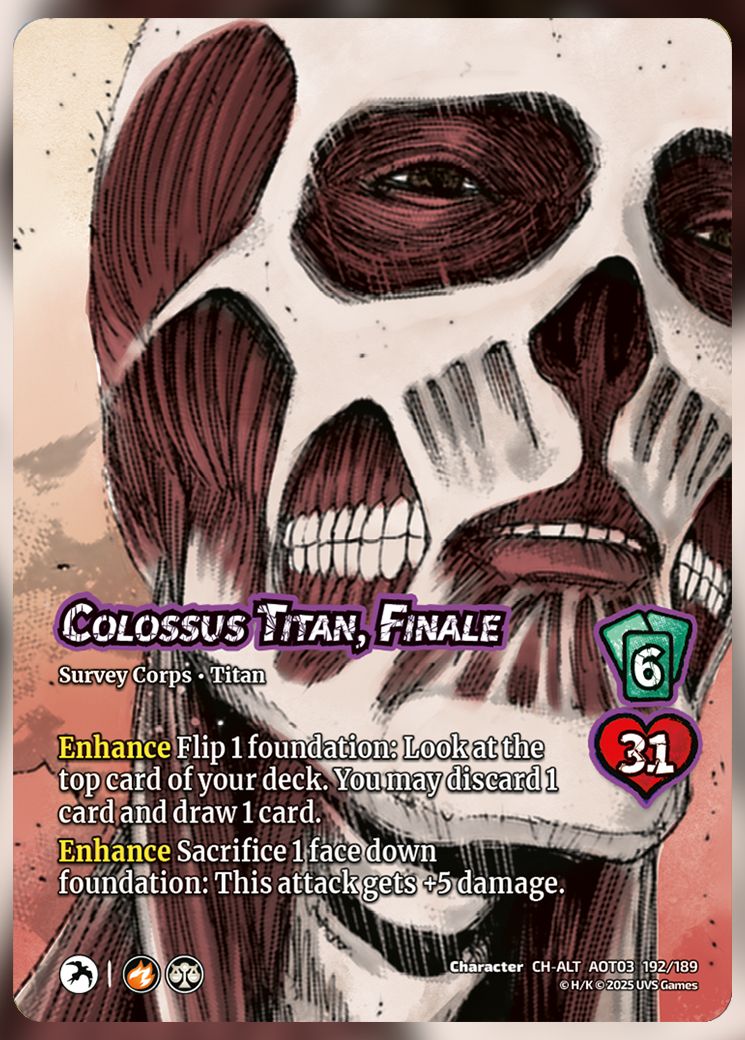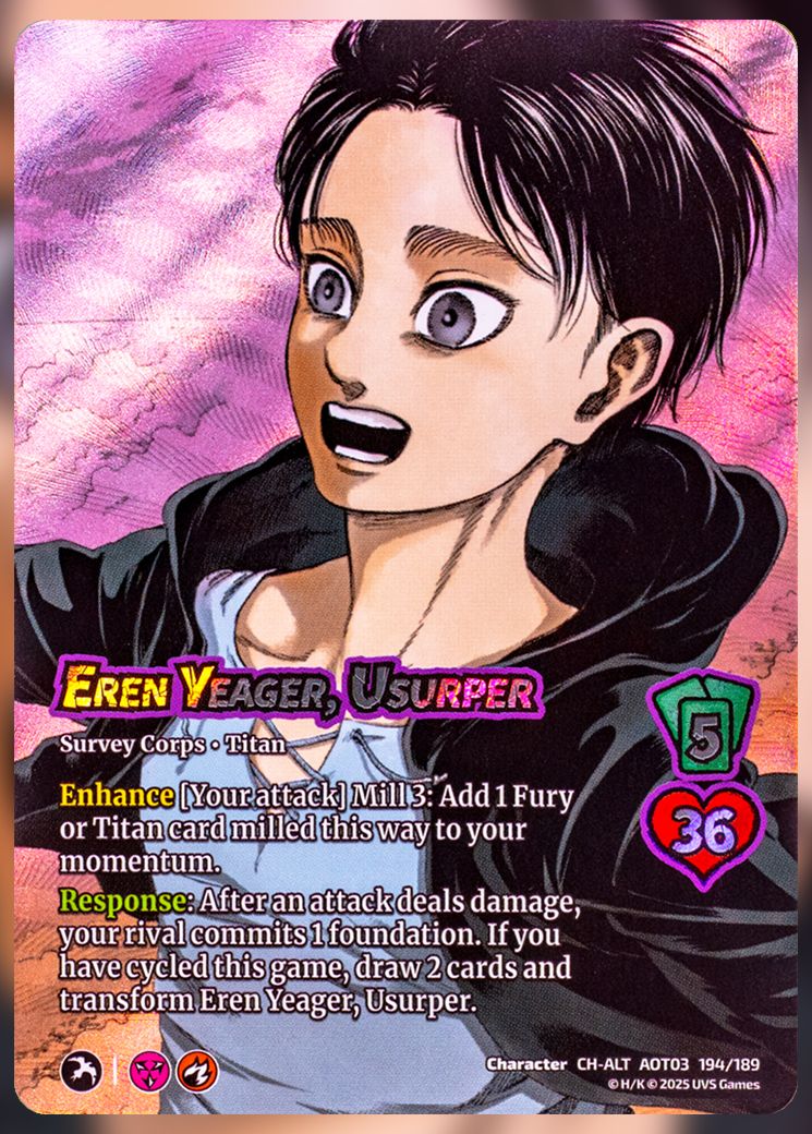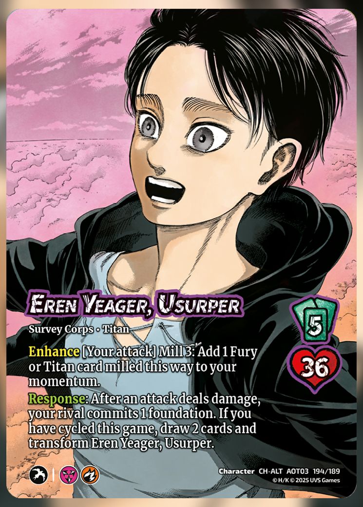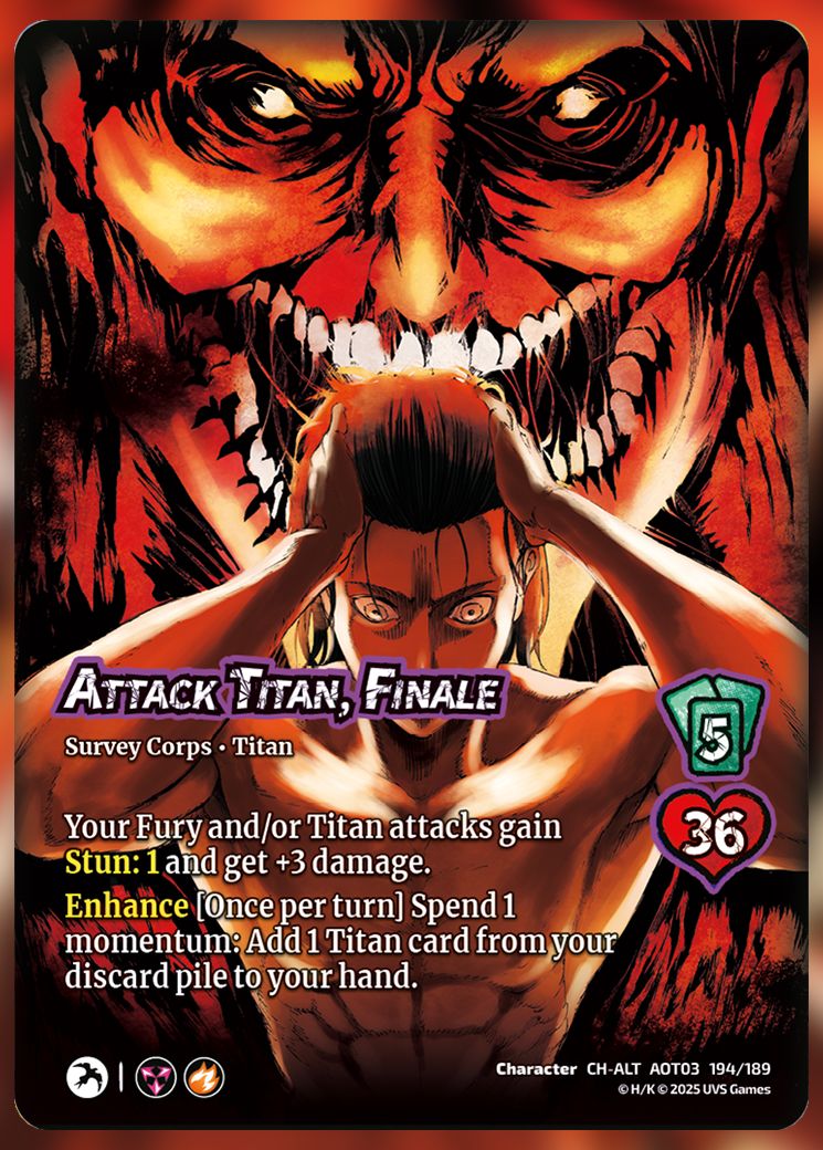 关闭 | 艾伦·耶格尔,篡位者调查兵团 – 泰坦 – 5 手大小 – 36 生命 – 混沌/火 提高[你的攻击]铣削3:将一张以此方式铣削的狂怒或泰坦卡添加到你的动力中。 回复:攻击造成伤害后,你的对手会贡献 1 点基础。如果您已循环此游戏,则抓 2 张牌并变身篡位者埃伦·耶格尔。 进击的泰坦,结局调查军团 – 泰坦 – 5 手大小 – 36 生命 – 混沌/火焰 你的狂怒和/或泰坦攻击增益眩晕:1并获得+3伤害。 提高[每回合一次]花费1点动量:从你的弃牌堆中将一张泰坦卡加入你的手牌。 |