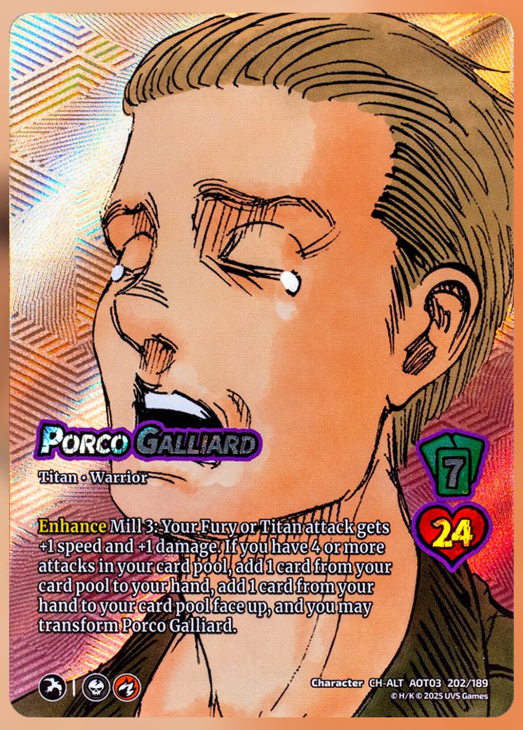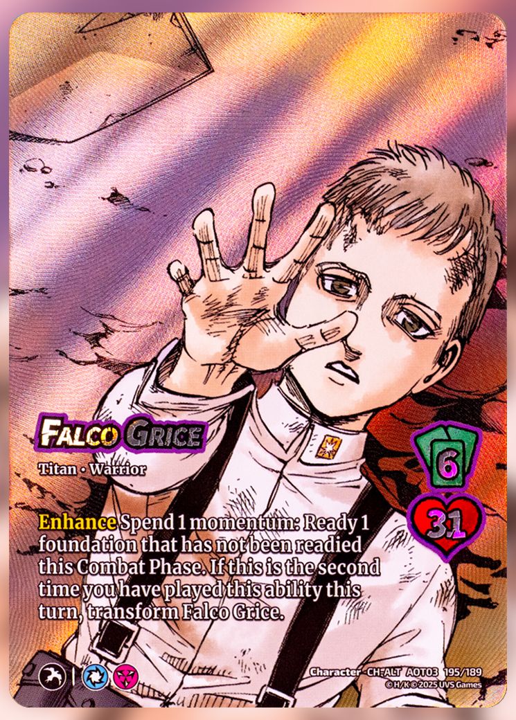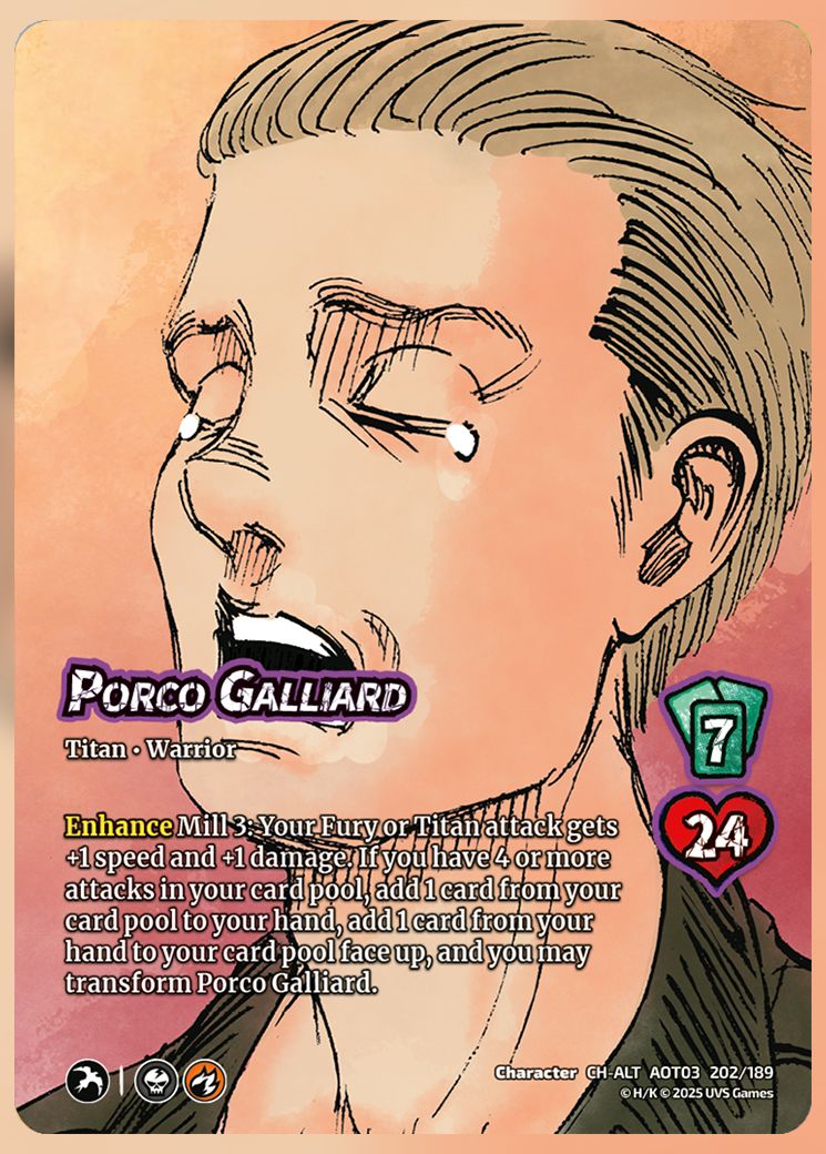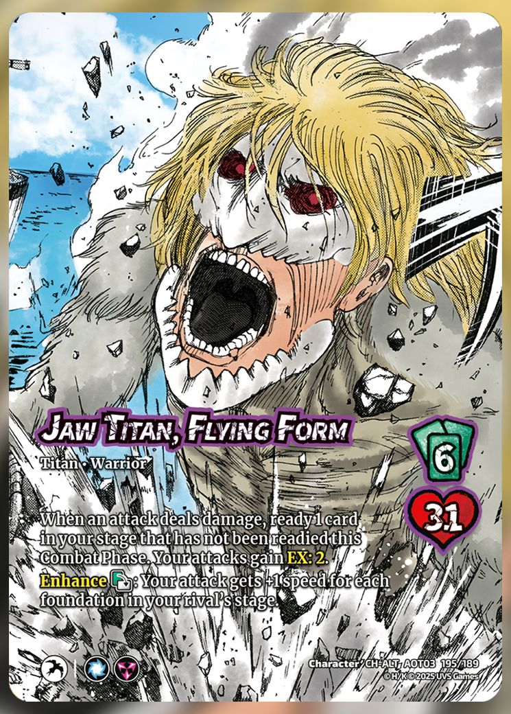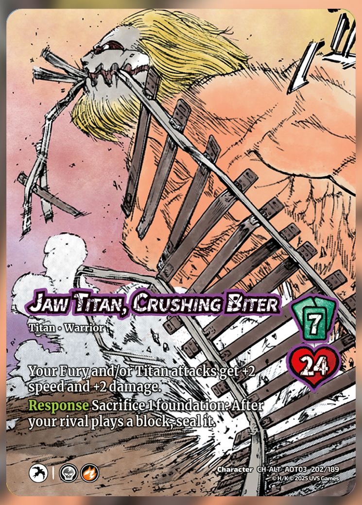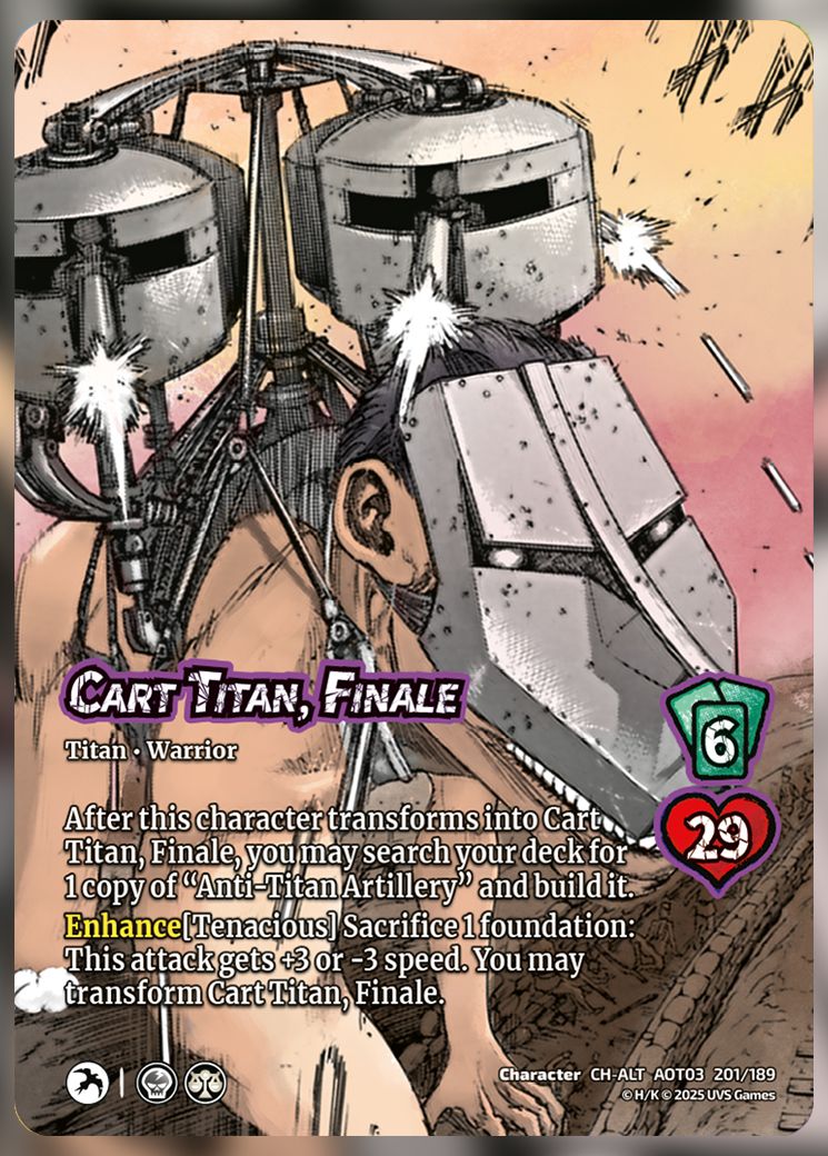 关闭 | 艾伦·耶格尔,篡位者调查兵团 – 泰坦 – 5 手大小 – 36 生命 – 混沌/火 提高[你的攻击]铣削3:将一张以此方式铣削的狂怒或泰坦卡添加到你的动力中。 回复:攻击造成伤害后,你的对手会贡献 1 点基础。如果您已循环此游戏,则抓 2 张牌并变身篡位者埃伦·耶格尔。 进击的泰坦,结局调查军团 – 泰坦 – 5 手大小 – 36 生命 – 混沌/火焰 你的狂怒和/或泰坦攻击增益眩晕:1并获得+3伤害。 提高[每回合一次]花费1点动量:从你的弃牌堆中将一张泰坦卡加入你的手牌。 |