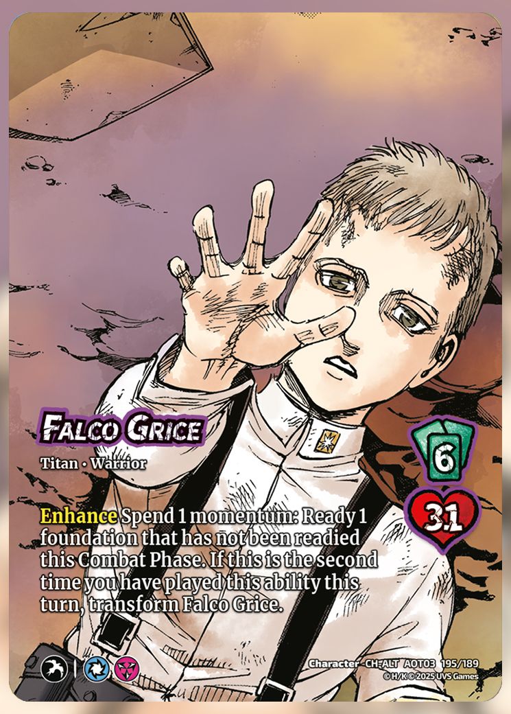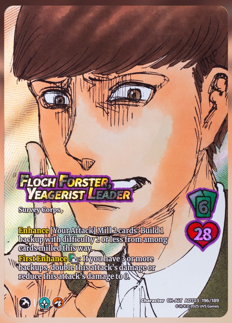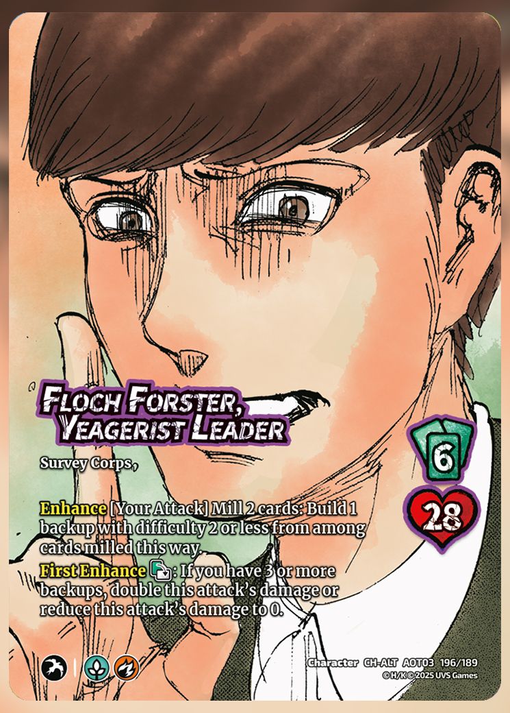 关闭 | 弗洛赫·福斯特(Floch Forster),耶格尔主义领袖调查兵团 – 6 手大小 – 28 生命值 – 生命/火 提高[你的攻击]碾磨2张卡:从以这种方式碾磨的卡片中用困难的2张或更少的卡片构建1个备份。 第一次增强承诺:如果你有3个或更多备份,则将此攻击的伤害加倍或将此攻击的伤害降低至0。 |