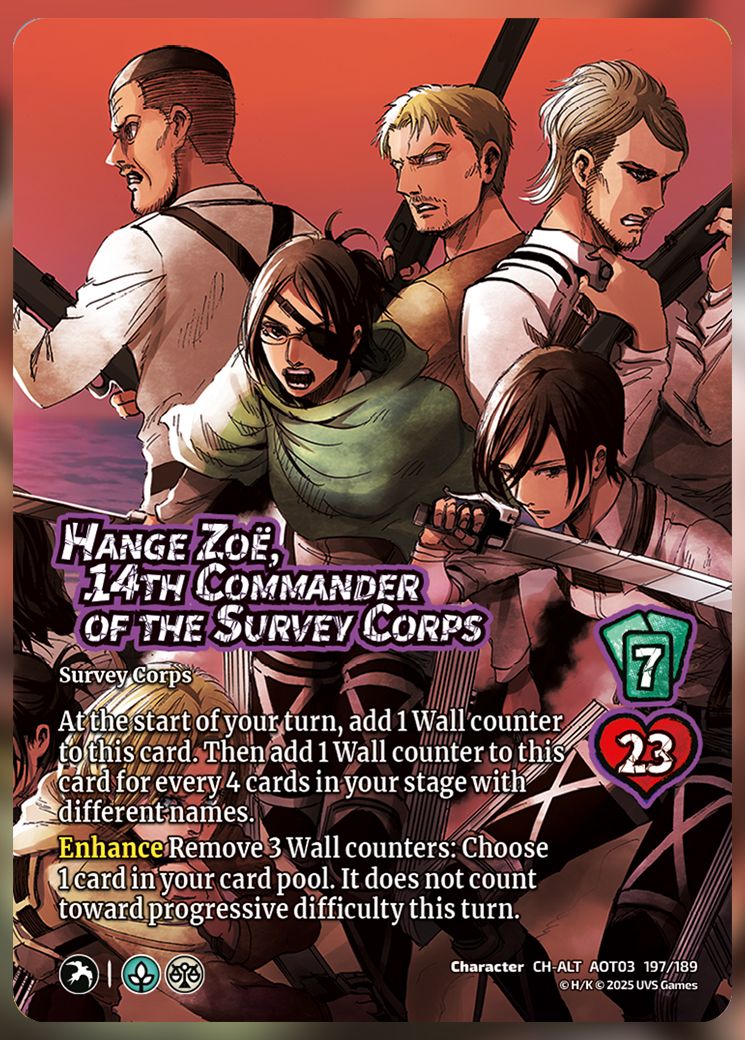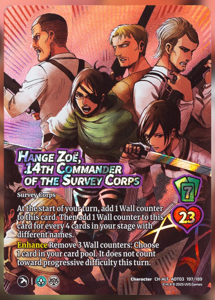 关闭 | 汉杰·佐伊(Hanje Zoe),第 14 调查兵团司令调查兵团 – 7 手大小 – 23 生命值 – 生命/秩序 在你的回合开始时,在这张卡上添加 1 个墙指示物。然后,你的舞台上每有 4 张不同名称的卡牌,就在这张卡上添加 1 个墙指示物。 提高移除 3 个墙指示物:选择你牌池中的 1 张牌。本回合不计入渐进难度。 |