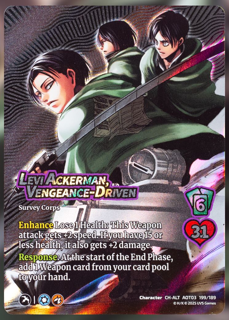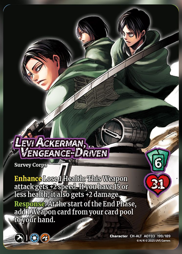 关闭 | 利维·阿克曼《复仇驱动》调查军团 – 6 手大小 – 31 生命值 – 空气/火 提高失去 1 点生命值:该武器攻击速度 +2。如果你的生命值为 15 或更少,它也会受到 +2 伤害。 回复:结束阶段开始时,从卡池中将1张武器卡加入手牌。 |