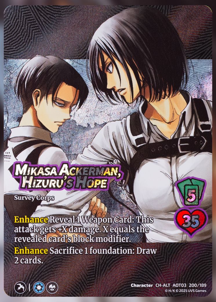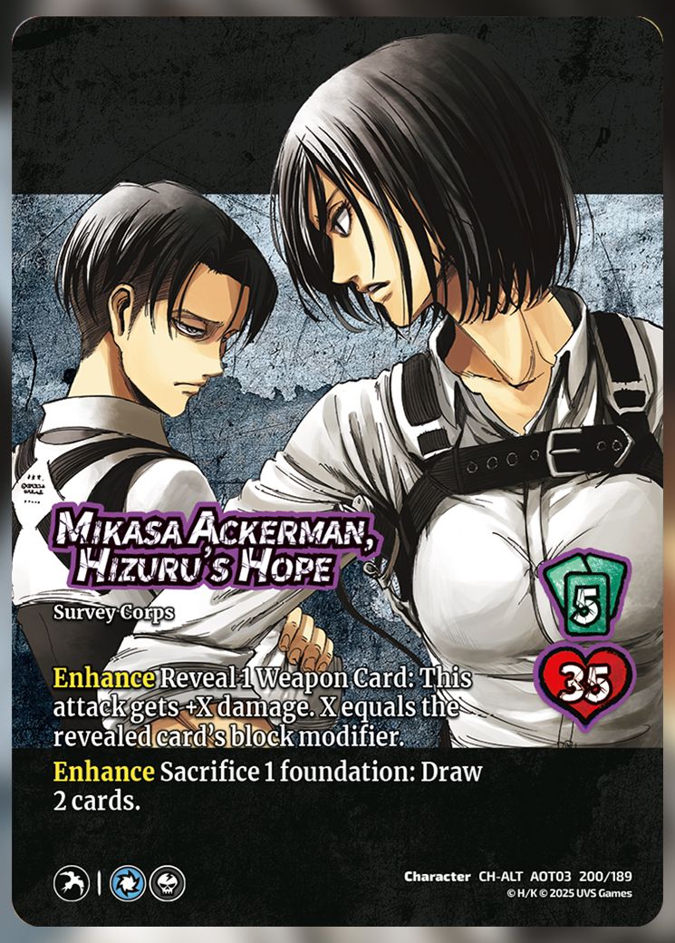 关闭 | 三笠阿克曼《日鹤的希望》调查军团 – 5 手大小 – 35 生命值 – 空气/死亡 提高显示 1 张武器卡:此攻击获得 +X 点伤害。 X 等于翻开的牌的格挡修正值。 提高牺牲 1 个基础:抓 2 张牌。 |