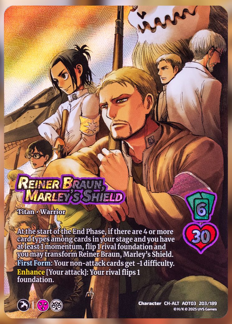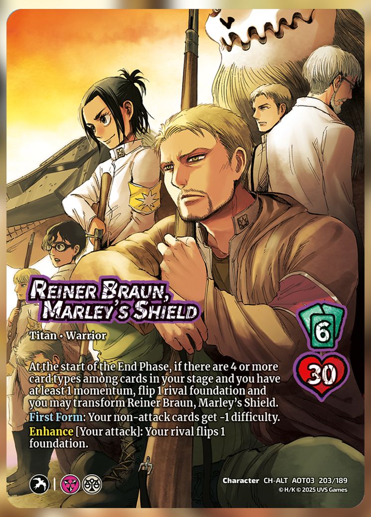 关闭 | 莱纳·布劳恩,马利之盾泰坦 – 战士 – 6 手大小 – 30 生命值 – 混乱/秩序 结束阶段开始时,自己阶段的卡牌种类有4种以上,且自己的动量在1以上时,翻转敌方1个基础,可以将莱纳·布劳恩·马利之盾变身。 第一种形式:你的非攻击卡牌难度为-1。 提高[你的攻击]:你的对手翻转1个地基。 装甲泰坦,结局泰坦 – 战士 – 6 手大小 – 30 生命值 – 混乱/秩序 你的攻击对你舞台中的每一种卡牌造成的伤害+1。 对手的攻击受到-1伤害。 回复在你的舞台上提交 1 张牌:进行一次攻击后,提交或翻转 1 个对手地基。 |