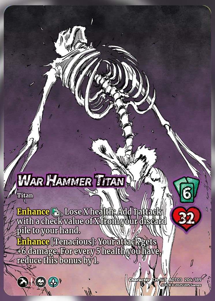 | 战锤泰坦泰坦 – 6 手大小 – 32 生命值 – 死亡/生命 提高提交,失去 X 点生命值:从你的弃牌堆中将 1 次检查值为 X 的攻击添加到你的手上。 提高[顽强]:你的攻击受到+6伤害。每拥有 5 点生命值,该奖励就减少 1。 |