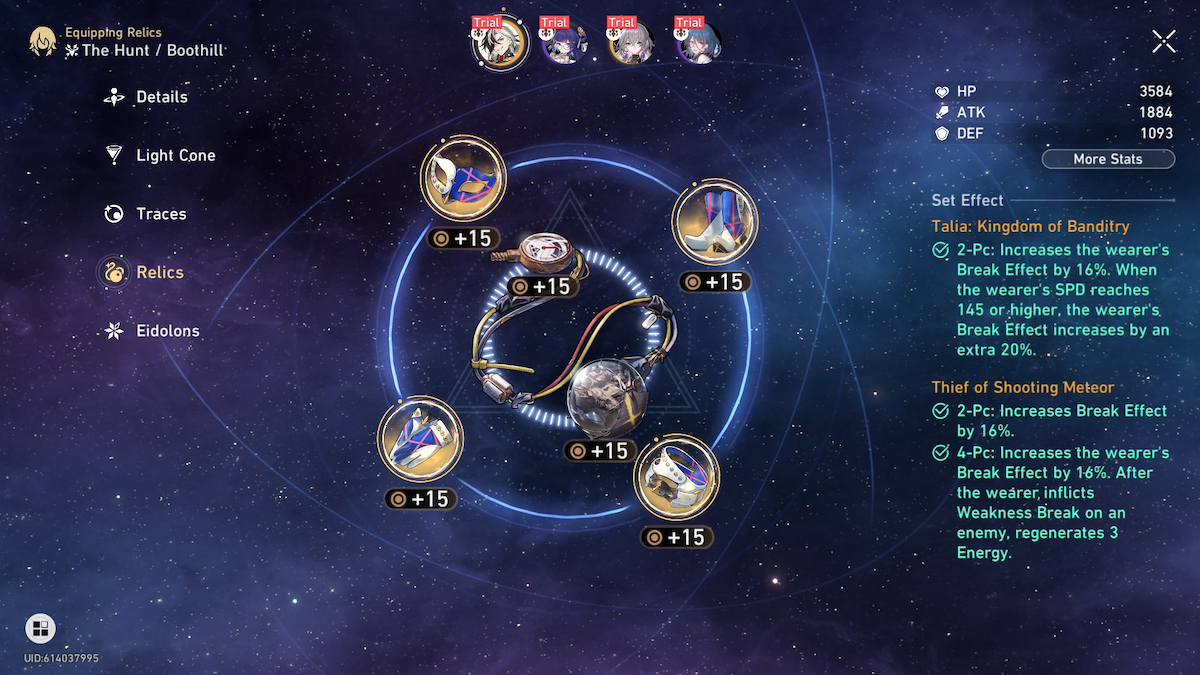 Boothill 的构建相当简单,并且不需要像其他 DPS 角色那样投资多个统计数据,因为他的主要伤害来源只是破坏效果。然而,建立 SPD 也非常重要,因为他能够进行额外的回合,让他每个周期可以消灭多个敌人。大多数情况下,您应该在所有遗物上叠加破坏效果和 SPD。一个好的 SPD 断点目标是 145,但你绝对可以叠加更多的 SPD,让他每个周期可以转多个回合。