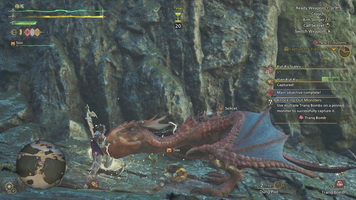 当你想要捕获怪物时,在遭遇怪物的第一部分没有任何变化。一切都是一样的:你在哪里与它战斗,将它分解成碎片,并试图耗尽它。最终,小地图上怪物旁边会出现一个骷髅符号,表明它已接近死亡。你的 Palico 也大喊这个图标,预示着即将下跌。