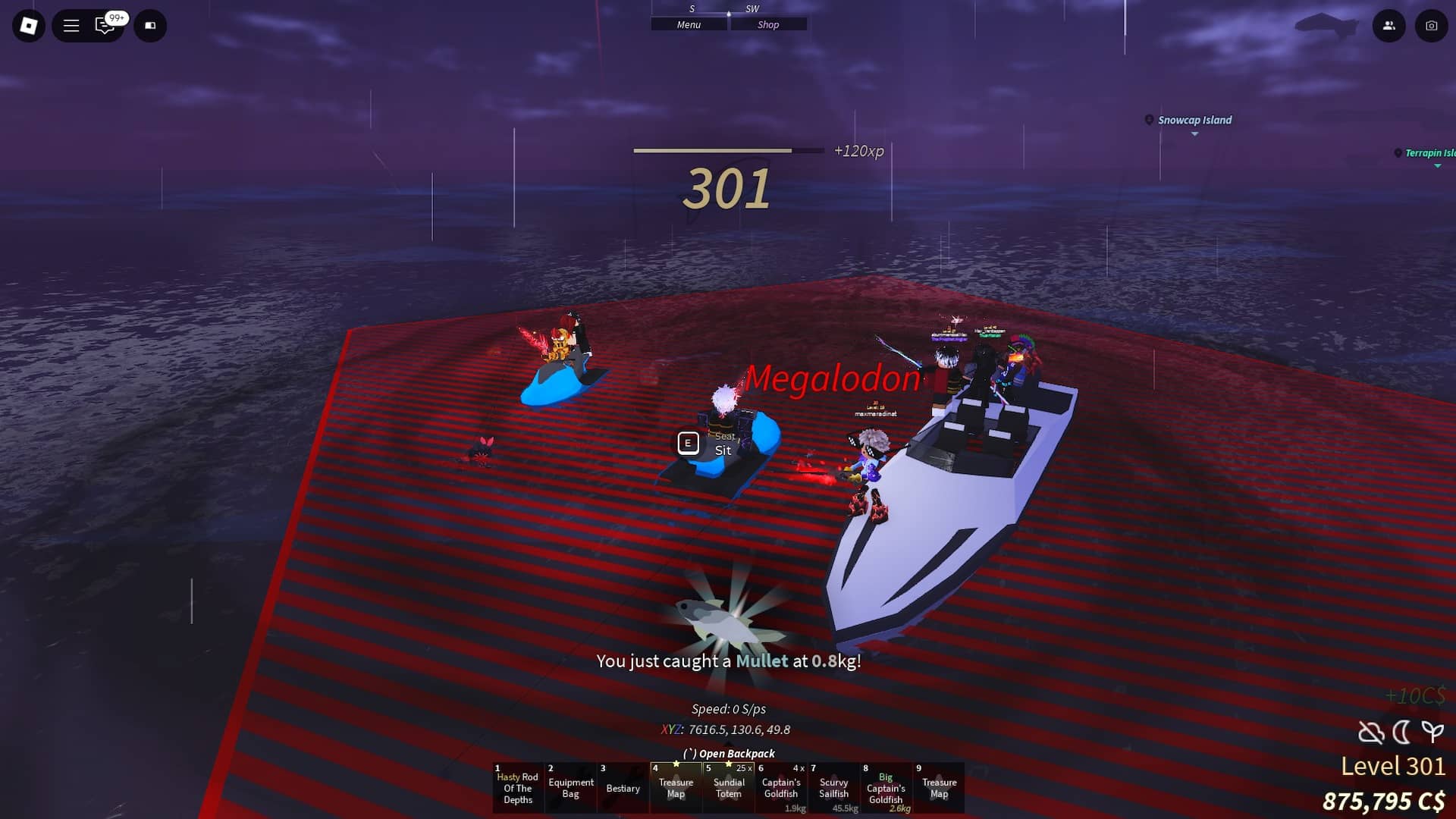这巨齿鲨事件在费施开始于远古岛屿后面的开阔海洋(~7200, 130, 200),右当白天/夜晚切换发生时。发生的概率是相对较高与其他活动相比,目前它比常规的鲨鱼狩猎活动要普遍得多。