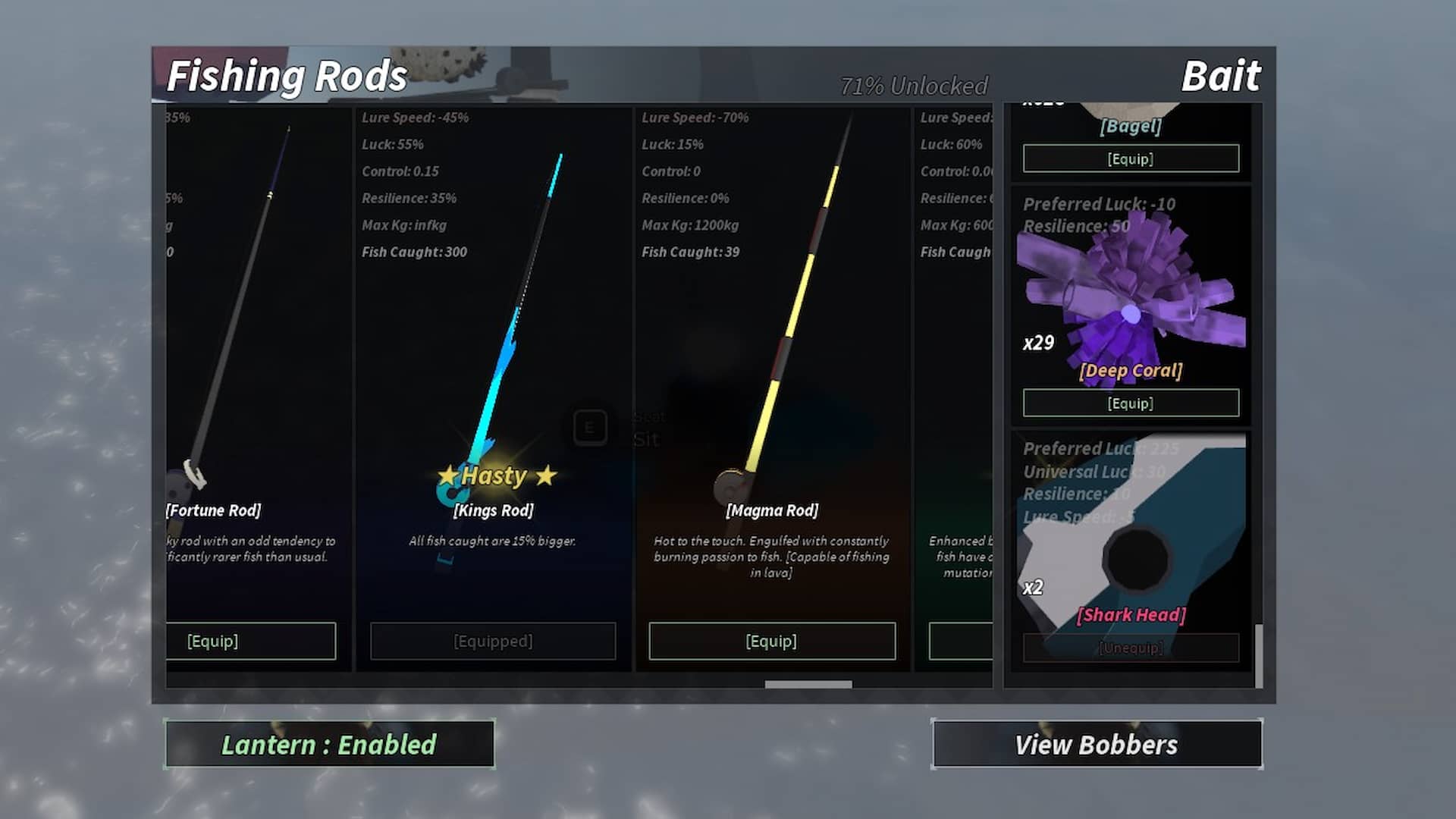 永恒之王之杖 | 饵:25% 运气:150% 控制: 0.1 弹力: 0% 最大公斤数: 75,000 价格:200,000 + 制作 | 有弹性的 受控 稳定的 | 鲨鱼头 海藻 百吉饼 珊瑚 |