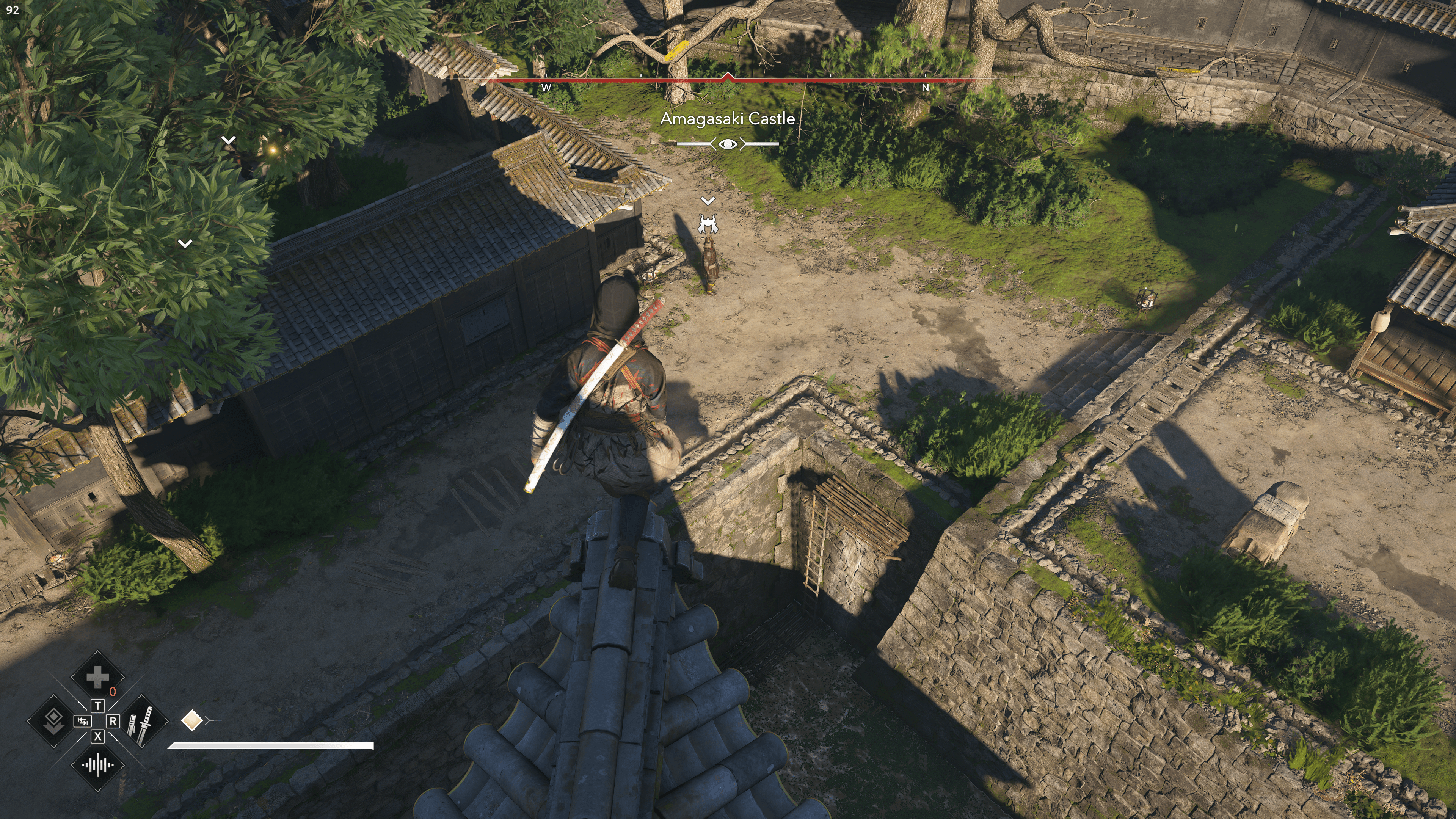尼崎城内,武士大将们分散得很远。我的建议是登上尼崎的主城,解锁快速旅行点,然后使用鹰眼视觉绕城郊外走一圈。这使您可以标记红色轮廓的敌人并查看武士大将正在巡逻的位置。