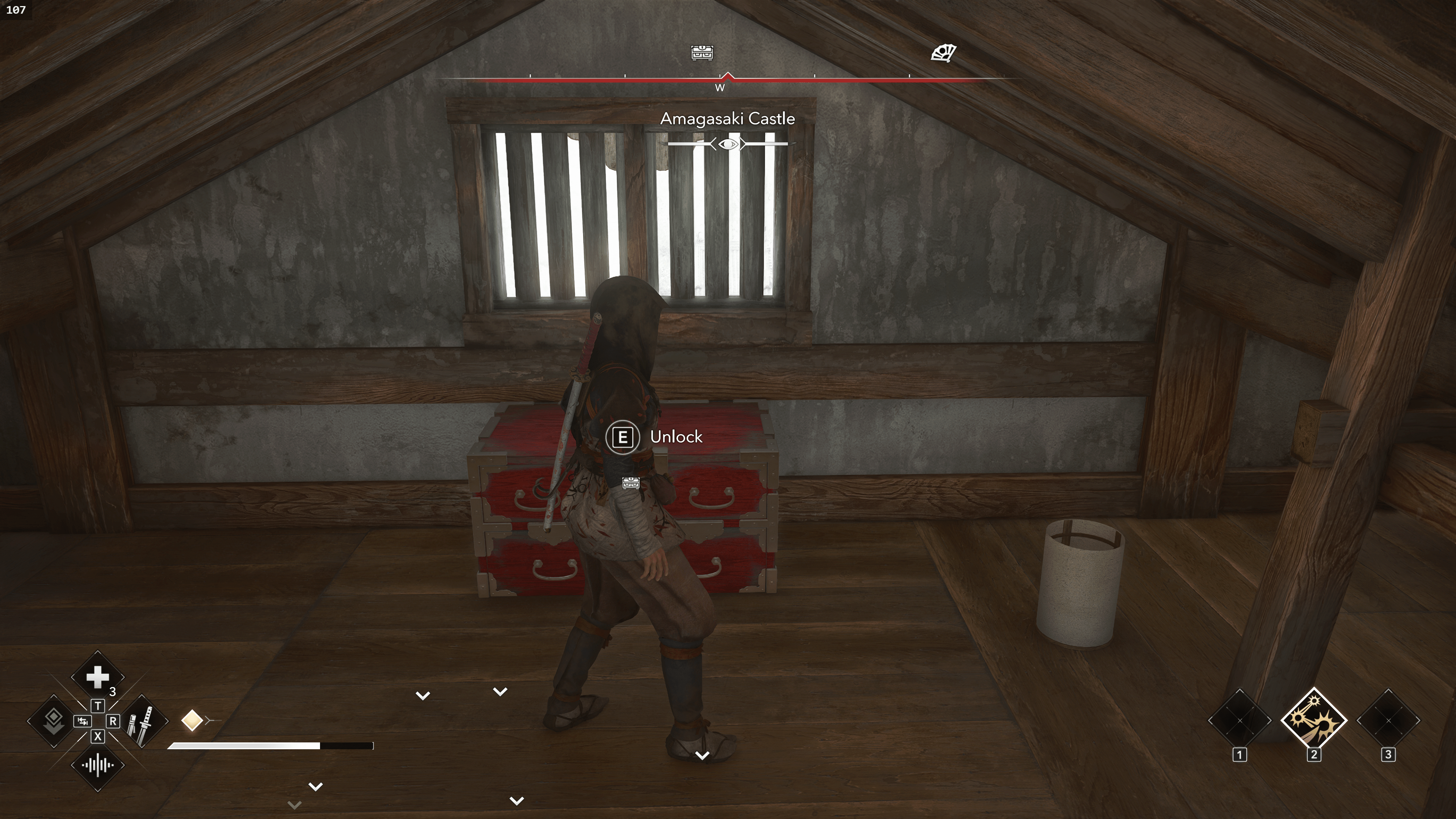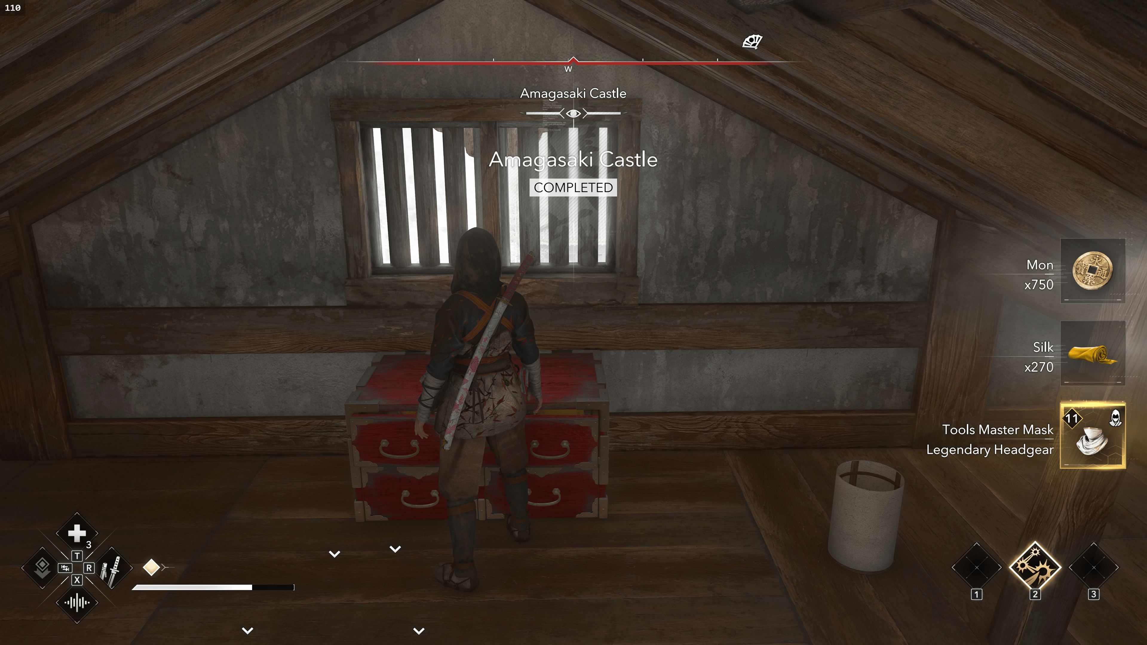 干掉所有五名武士大将后,前往尼崎的主城,即拥有快速移动点的城堡。登上城堡顶部,但不要去快速旅行点。相反,在屋顶上找到一块地板,跳到里面,抢劫房间里的特殊箱子来解锁你的奖励。