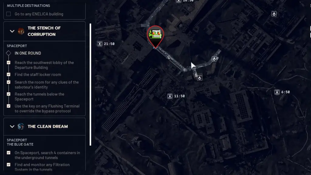 第一个任务是从下面屏幕截图中标记的位置进入出发大楼。进去然后右转。直走,左转,你会发现一段楼梯,通向员工更衣室。你必须在房间里搜寻与破坏者有关的线索。